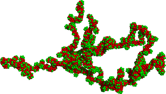We know that dust grains are elongated, perhaps needle shaped, with sizes of about 1000Å, about the wavelength of light that the grains scatter most efficiently. Dust characteristics vary somewhat from place to place in the Galaxy, but a typical grain is believed to be composed of carbon in a graphite-like crystal structure, mixed with silicates (eg MgSi03 like olivine). Nearly all of the elements like Carbon and Silicon in the ISM are tied up in dust. In molecular clouds the grains appear to be coated with a water-ice shell. Ned Wright at UCLA has developed a fractal model for interstellar dust grains shown in this APOD.