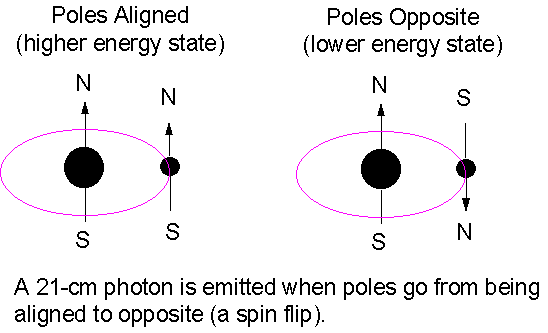 The Milky Way Galaxy is filled with a very diffuse distribution of neutral hydrogen gas which has a typical density of about 1 atom/cm3 (10-24g/cm3). The interstellar medium is far too cool to excite the UV or optical transitions of hydrogen, but there is a feature at 21 cm wavelength in the radio produced by the spins (magnetic fields) of the hydrogen atom's nuclear proton and orbiting electron. Because the proton and electron are spinning distributions of electric charge they create minute magnetic fields which interact, creating a small energy difference between the state in which the poles are aligned versus counter-aligned. This energy difference corresponds to the energy of radio waves at 21-centimeters. Every once in a while (about once per 500 years) hydrogen atoms will collide, exciting an atom into the higher energy spin-aligned configuration. It will take as long as 30 million years for the atom to jump back to the lower energy state via a spin-flip, emitting 21 cm radio emission.