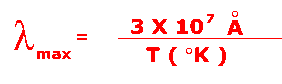 with wavelength in angstroms (Å) and temperature in degrees Kelvin. Here is a Java Thermal Radiation Experiment which will allow you to determine the relationship between temperature and wavelength. The table below shows some astronomical objects, their normal temperatures, and the wavelengths where they emit the most light.
