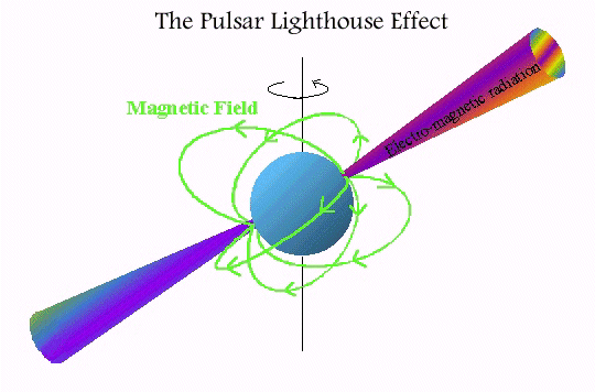 Whatever the detailed mechanism, radiation near the neutron star poles produces strong, narrow beams of light which sweep around the sky like a tilted lighthouse, as shown below. If the earth lies in the path of the beam we see a pulsar. (This idea has the added attraction that it explains why we don't see pulsars in all supernova remnants.)